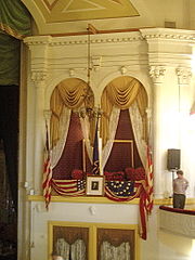 Ford's Theatre, originally built in 1833 as the First Baptist Church of Washington before being purchased by John T. Ford and converted to a theatre, is among the most famous theatres in the world. On April 14, 1865, John Wilkes Booth went up to the presidential box, and shot Abraham Lincoln in the head. He then jumped down to the stage, yelled either "Sic semper tyrannis!" or "The South is avenged!" then ran out the back. Lincoln was carried accross the street to Petersen's Boarding House, where he was tended to through the night. At 7:22 am of the following day, Abraham Lincoln died.