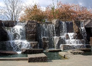 The Franklin Delano Roosevelt Memorial is a monument that spans 7.5 acres, symbolizing the twelve years of FDR's presidency in four outdoor rooms. Sculptures whow scenes like listening to fireside chats, waiting in a bread line, FDR sitting with his dog Fala, and FDR's wife, Eleanor Roosevelt. Each of the four outdoor rooms has a water feature, increasing in intricasy as you progress through each room. Because of FDR's disability, this monument was designed to be accessible to those with disabilities.