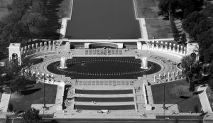 As you walk towards the semicircle from the east, walls on either side show scenes of soon-to-be soldiers getting physical exams and taking oath, going to combat, burying dead, and finally a homecoming scene. The right-side wall shows the same, though scenes are more like what happened in Europe. The last scene is a handshake between America and Russia. On the west side of the memorial stands Freedom Wall. On this wall are 4,048 gold stars, each one representing 100 Americans who died in World War II.