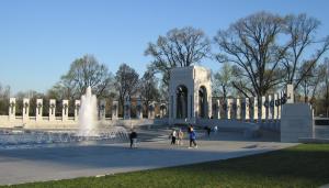 The National World War II Memorial is dedicated to all those who served in the armed forces and as civilians in World War II. It is 56 pillars and two arches surrounding a fountain. The monument was opened to the public April 29, 2004. The design was chosen in a design competition with 400 submissions, the winning one belonging to Friedrich St. Florian. The name of each of the 48 states of 1945 are carved into one of the pillars, along with the District of Columbia, Alaska Territory, Territory of Hawaii, Commonwealth of the Philippines, Puerto Rico, Guam, American Samoa, and the U.S. Virgin Islands. The northern arch has Atlantic carved into it, and the southern arch has Pacific. There is also a carving saying "Kilroy was here."